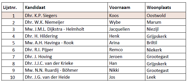 Begin 2025 werd Koos Siegers, huidig fractievoorzitter van de ChristenUnie in het Westerkwartier, door de leden gekozen tot lijsttrekker voor de Gemeenteraadsverkiezingen 2026. De afgelopen maanden is gewerkt aan een representatieve en evenwichtige kandidatenlijst. De lijst bestaat uit 40 kandidaten met daarbij o.a. zittende raads- en commissieleden, aanstormend talent en gevestigde namen. De top tien van de lijst ziet er als volgt uit: